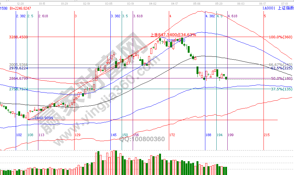 時間是決定市場走勢最重要因素。回顧贏家江恩系統工具點評時間窗口,4月22號指出降低倉位至3成,4月25號提示低風險者空倉休息,5月9號時間窗口提示短線高風險可以開倉,17號時間窗口前(15、16號)提示獲利出局,這兩天提示短線周期時間窗口(23號)將確認一關鍵位,從收盤數據看,市場明日失守波段百分比180度2834點,價格拐點將是5月第三個日線時間窗口28、29號,在此時間段,無技術、無紀律者休息不要再被收割了,你是否將1季度的收益已回吐市場?要改變虧損的現狀,從擁有一套完整交易體系開始。江恩理論研究時空運行,通過工具預判出時間后,空間上則看趨勢工具極反通道藍色下軌線(VIP學員查看相應位置)。日線藍色下軌線站穩將是又一次操作機會,待整固結束后市場必會有一波反彈到生命線行情,而這機會是留給有準備的交易者。24號盤中壓力是315度2844點、0度2860點,盤中支撐是225度2815、180度2800點。操作策略,指數擊破黑色生命線進入弱勢區域,高風險者倉3-4成,低風險者本周進入備戰期。
