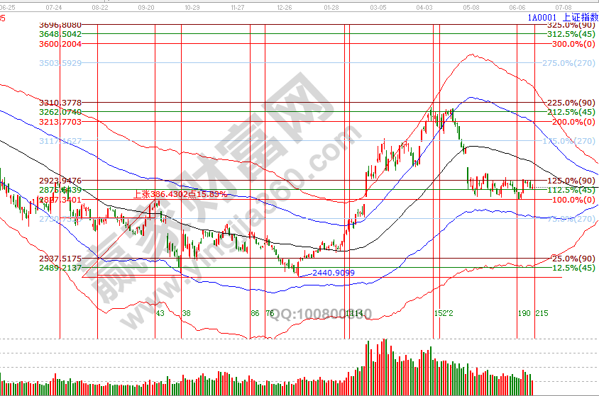 指數(shù)連續(xù)兩個(gè)交易日收盤在贏家江恩系統(tǒng)工具分析的關(guān)鍵區(qū)2880-2890之間,周一盤中擊破2880后收復(fù),此區(qū)間是江恩價(jià)格圖表四方形和60分鐘極反通道生命線,運(yùn)用多周期結(jié)合判斷,關(guān)鍵位不破保持市場延續(xù)反彈的觀點(diǎn)。如受外因不確性因素影響,波段百分比延伸線2834點(diǎn)是強(qiáng)支撐,該位置是近1個(gè)多月來箱體震蕩平臺下沿,重要性不言而喻。反彈第一目標(biāo)位2950位置,第二目標(biāo)位是日線黑色生命線,在可承受的風(fēng)險(xiǎn)持倉內(nèi)保持平和的心態(tài)應(yīng)對市場。6月18號盤中壓力是135度2911點(diǎn)、180度2928點(diǎn),盤中支撐是0度2860、315度2844點(diǎn)。操作策略,指數(shù)處于極反通道弱勢區(qū)域的反彈走勢,繼續(xù)關(guān)注2880-2890區(qū)間得失,整體持倉保持3-5成。