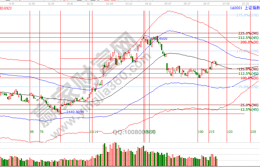 市場走勢(shì)同20號(hào)分析一致,圍繞日線極反通道黑色生命線上下震蕩,按歷史規(guī)律,自下向上的突破生命線需要量能及3天時(shí)間確認(rèn),指數(shù)收盤價(jià)一直在生命線上,不足之處是量能出現(xiàn)持續(xù)萎縮,27號(hào)江恩時(shí)間窗口盤中關(guān)鍵位2966點(diǎn),結(jié)合周期關(guān)系,整體還處于反彈周期內(nèi),6月27號(hào)盤中壓力是0度2997點(diǎn)、45度3016點(diǎn),盤中支撐是2966點(diǎn)、2944點(diǎn)。操作策略,指數(shù)圍繞極反通道生命線震蕩,延續(xù)反彈走勢(shì)中,整體持倉保持3-5左右,7月3號(hào)時(shí)間窗口選擇方向。
