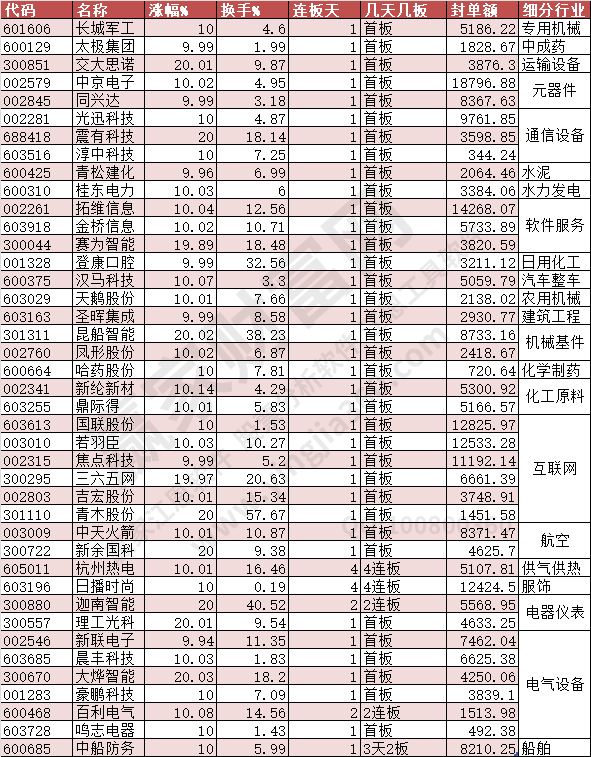 三、今日除新股一字板部分漲停(除ST)