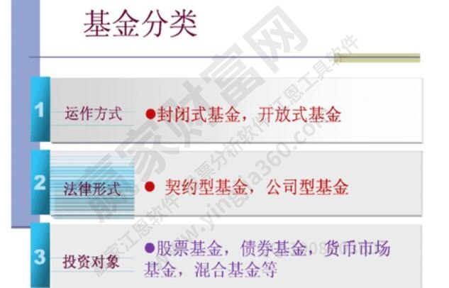 1、根據(jù)投資對象的不同分為貨幣基金、債券基金、混合基金、指數(shù)基金、股票基金和專項(xiàng)基金。