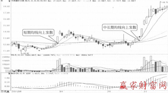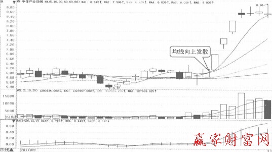 均線向上發散形態一旦完成,就表示市場處于上漲行情中。投資者不斷以更高的價格買入股票,而股票價格也不斷被推高。這種推動股價上漲的多方力量一旦凝聚起來,往往能夠持續很長時間,未來股價將會有一波大幅上漲。