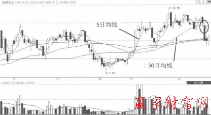 如圖所示,在華資實業的日k線中,該股見頂10.46元之后震蕩走低。圖中顯示股價在破位下跌的大陰線作用下,5日均線已經與30日均線瞬間完成死亡交叉形態,顯然出貨的時機已經到來了。前期股價的大幅度震蕩都沒有見頂回落的信號出現,這次出現的均線死叉形態顯然是股價見頂回落的表現。