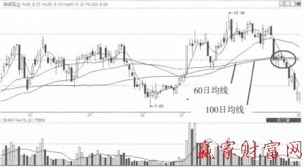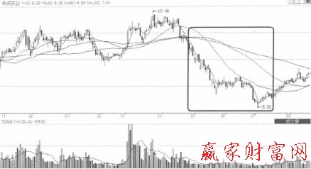 如圖所示,在華資實業的日K線中,5日均線在相繼與60日、100日均線形成死又之后,股價就已經登上熊途之中。下跌過程既然巳經在所難免,投資者就應當率先出貨。該股在探底最低價格5.52元的時候,累計的下跌幅度已經高達38%。死叉后提前出貨的投資者將因此而減少不小的損失。