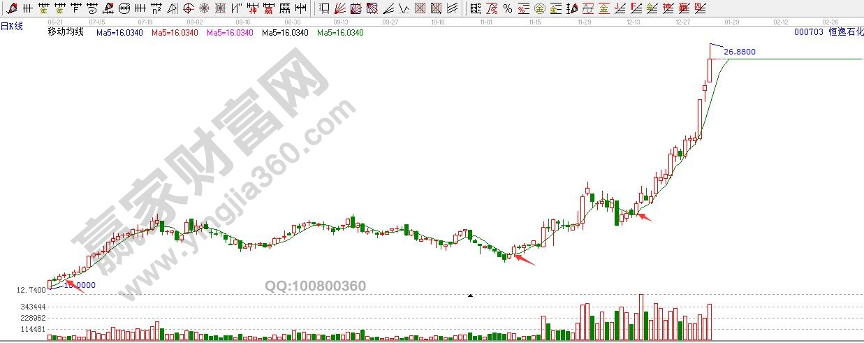 首先介紹一下520戰法。520這套戰法是兩條均線的組合,是選擇一條短期5日均線和一條20均線參數組合。問題來了,為何選取5和20均線呢?因為5日均線又叫“攻擊線”5日均線波動較快,更貼近股價的走勢,所以,在信號上更加迅速。5日之上的個股本身就比較強勢。例如下面的恒逸石化走勢圖。