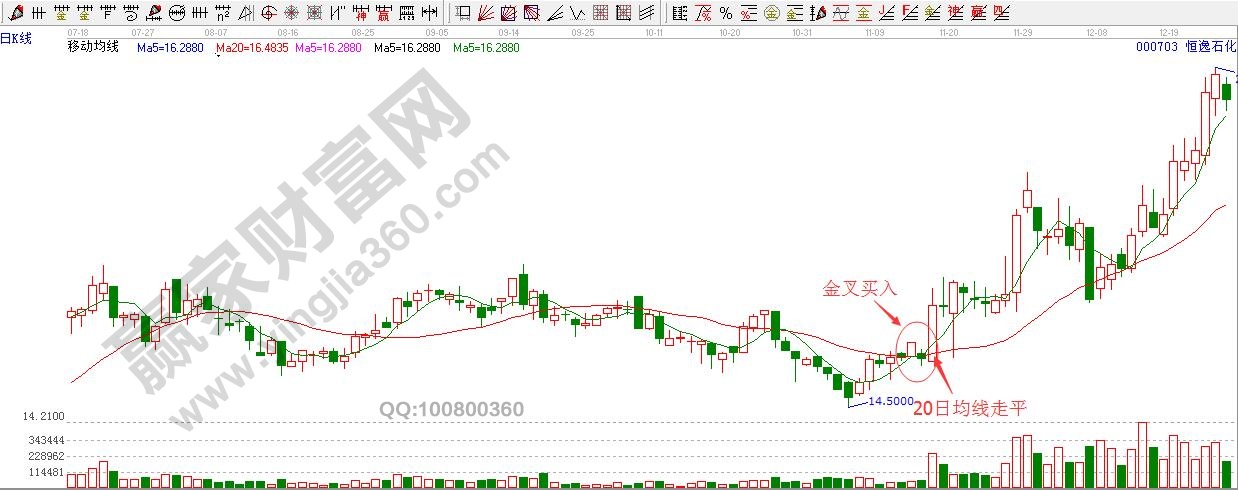 2、20日均線走平時,5日均線金叉20日均線。