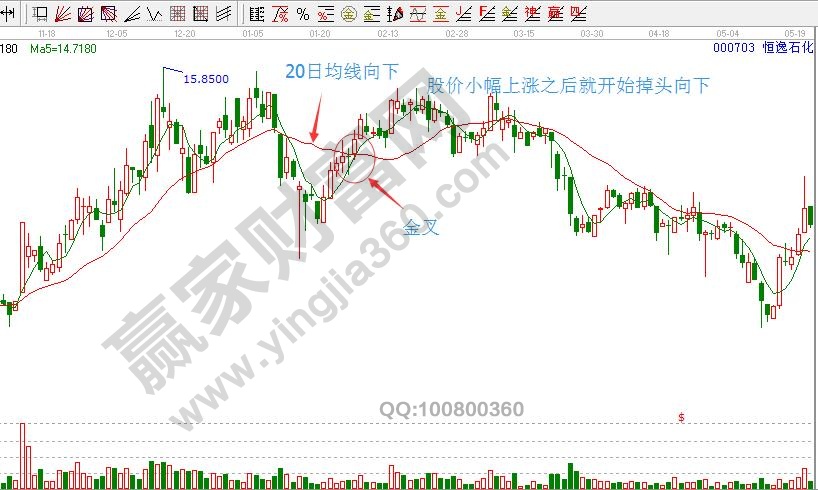 3、20日均線向下時,5日均線金叉20日均線。