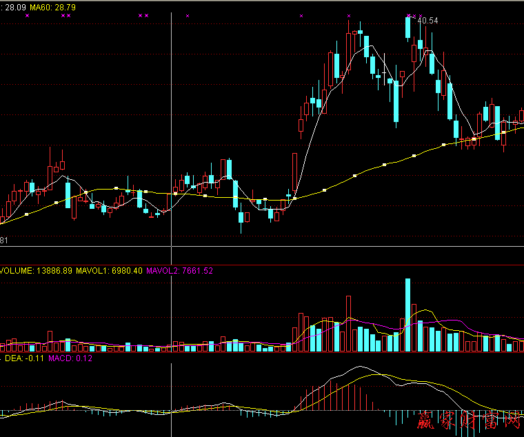 此戰法要點在于,股價拉升之后細心跟蹤,耐心等候其回撤到平衡點位時買進。展開來講,就是隨著股價沖高后的逐級盤低,成交量一般會逐漸回落,量柱線出現萎縮,較敏感的5日線隨著量能的縮減逐漸下降,靠近或死叉40日線。交叉瞬間往往意味著換手率出現新的平衡。大盤規律:量柱越高,越是莊家的主觀行為,量柱越低,就越是市場的自然行為,當自然行為出現新的平衡時,也就意味著新的買入時機。5日線下搭60日線,股價重新站穩10日線,成交迅速量放大,即出現當天的陽線增量才是最理想的選擇。