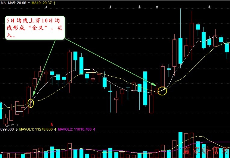 1.在股市中,投資者為了更能進一步的得到更多的信號,以此來提高自己操作的準確性。在下圖中,我們可以看到股價曲線由下向上突破5日、10日移動平均線,且5日均線上穿 10 日均線形成黃金交叉,此時投資者應該及時關注股市的變化,并且要及時入市。因為此時的股市必將會迎來一輪新的上漲趨勢,而黃金交叉的形成就已經預示著多方力量增強,并且股價已經突破空方的壓力線,奉勸投資者千萬不要喪失良機,應該及時入市,為自己盈利。