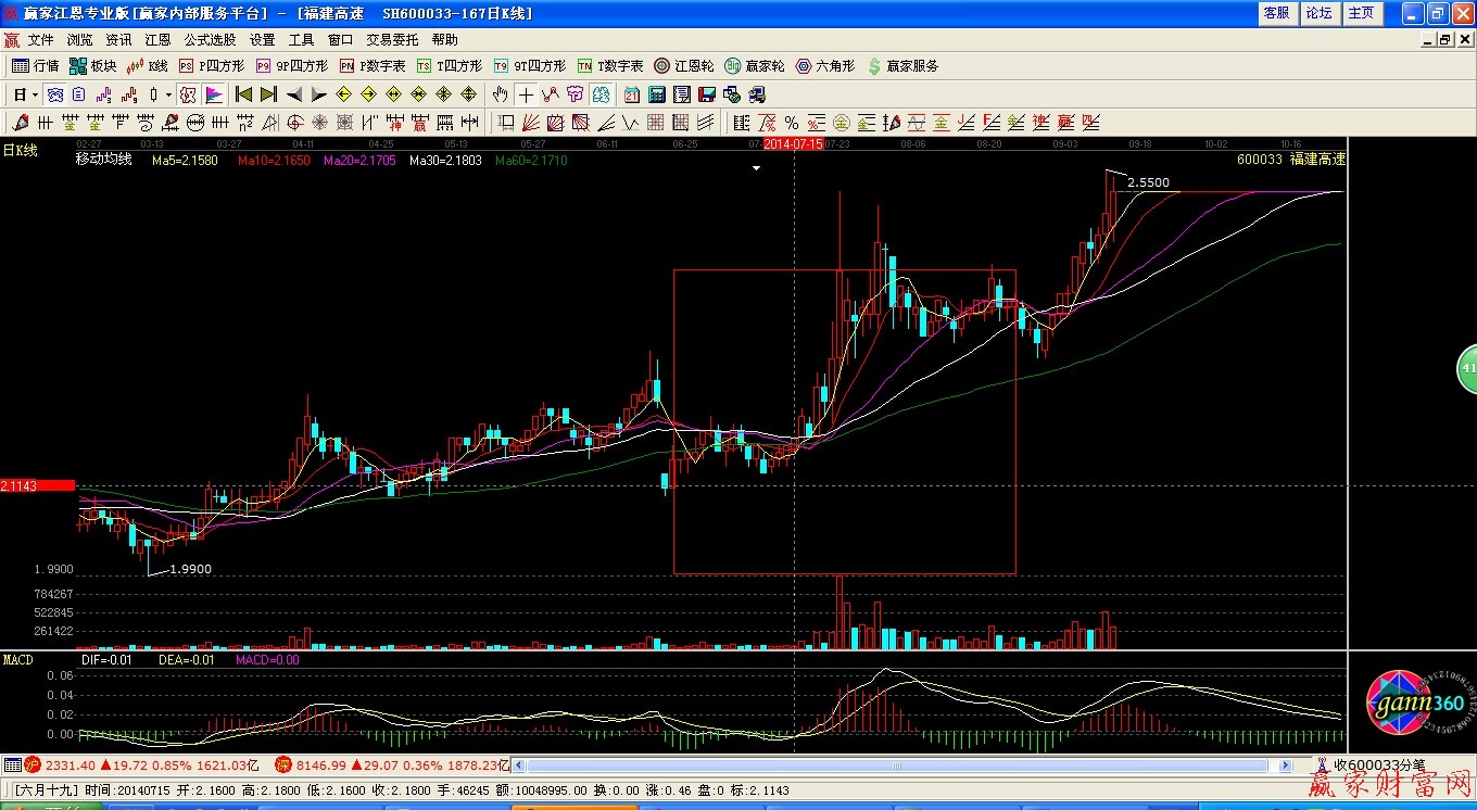 以這支股為例。股價在緩速上漲(此時均線發散角度并不大)之后出現短暫性下跌和整盤,整盤中多條均線黏合在一塊,股價在短暫的整盤之后迅速向上突破。均線系統給出了黏合之后向上發散的形態,此時也是對于投資者也是一個很好的介入點。如果能揣測到主力的意圖,可以感到主力有大量買入籌碼的想法。因此可以認定這個形態確定了市場底部,投資者可以在此時積極買入股票等待股價的大幅上揚。