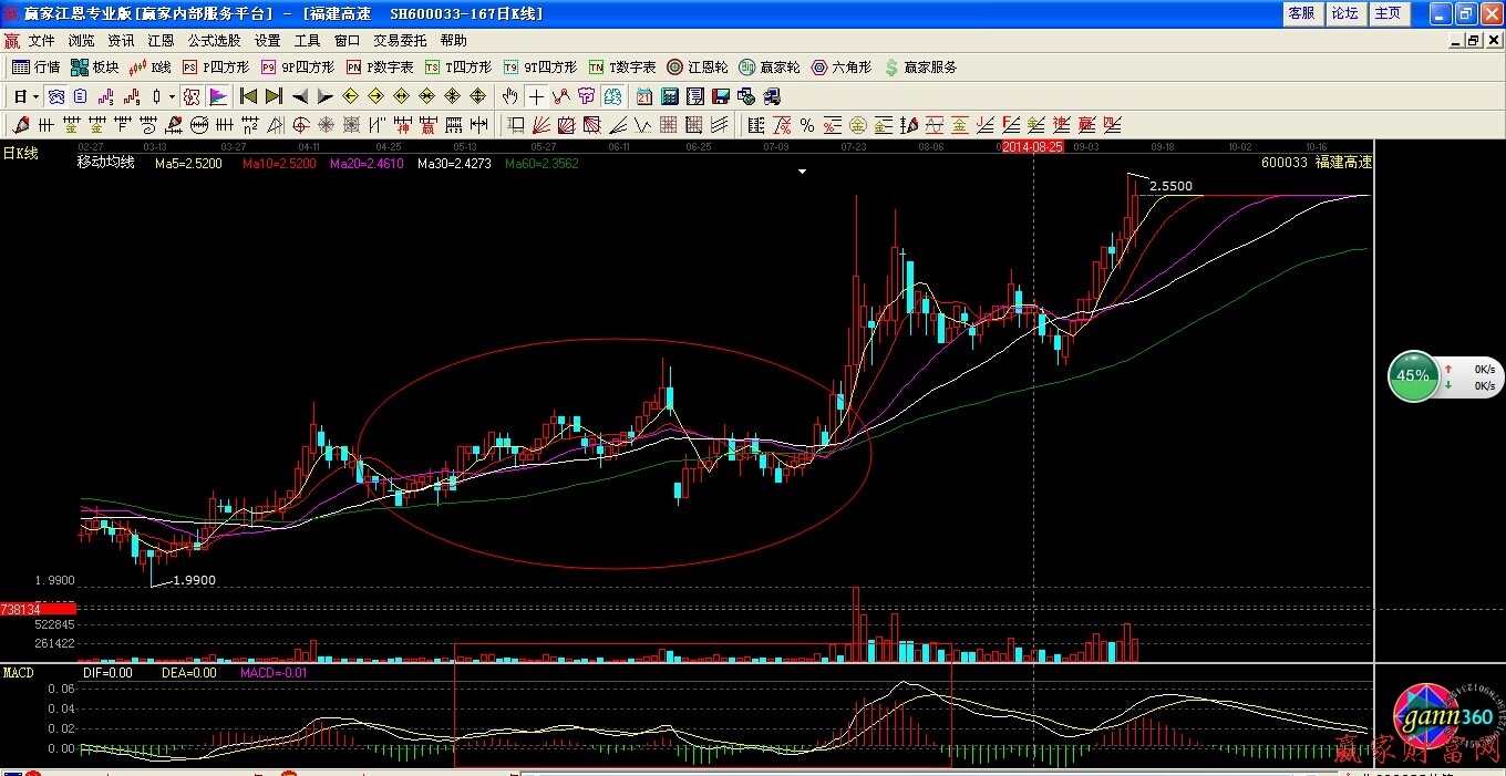 該股在所標(biāo)區(qū)域中長(zhǎng)時(shí)間震蕩,小幅度上漲,但卻也是一個(gè)多頭市場(chǎng),為什么這樣說呢?我們可以根據(jù)下方的MACD指標(biāo)分析,DIFF、MACD在0軸上方,中短期均線又短上長(zhǎng)下,由此可以判斷該股確實(shí)是一個(gè)多頭市場(chǎng)。DIFF線和DEA線長(zhǎng)時(shí)間黏合。偶有DIFF線突破DEA線,但也迅速反彈,并沒有跌破底價(jià)??梢钥闯鲞@支股潛力很大,可以看好。