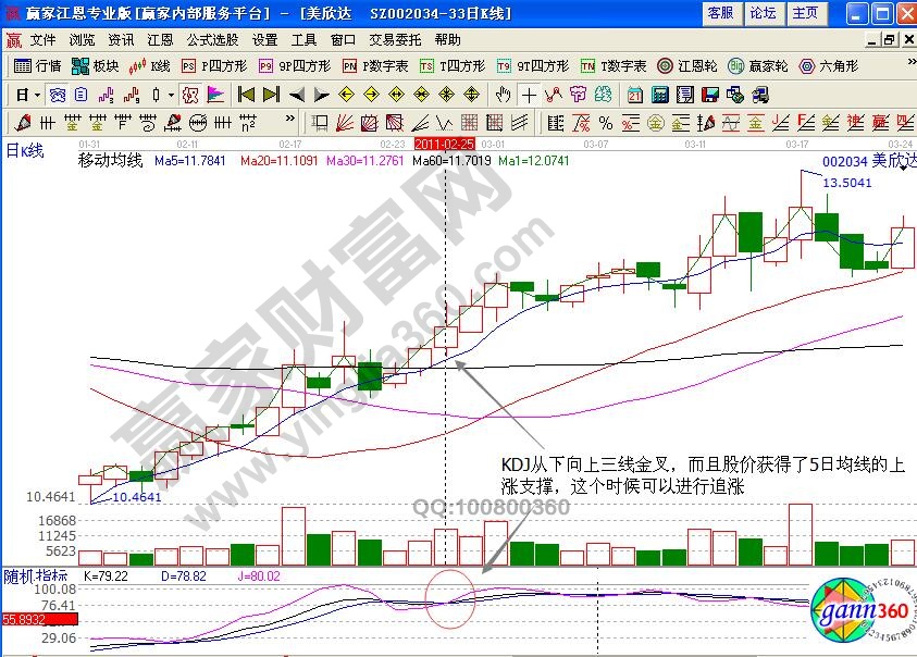 在個(gè)股的案例走勢分析中,kdj指標(biāo)的金叉和死叉形態(tài),能夠清楚的判斷個(gè)股走勢中對應(yīng)的買點(diǎn)和賣點(diǎn)的位置,比如美欣達(dá)(002304)在2011年2月25日的股價(jià)走勢形態(tài),在對應(yīng)的KDJ指標(biāo)中形成的就是三線金叉的一個(gè)買入點(diǎn)的位置,其次,就是kdj指標(biāo)的死叉形態(tài)是一個(gè)賣出的信號(hào),在2011年5月2日廣州發(fā)展(600098)的個(gè)股走勢中表現(xiàn)的很是完美,形成的是高位死叉的賣出信號(hào),投資者應(yīng)該及時(shí)的賣出或者進(jìn)行止損的操作,以規(guī)避后市的損失。