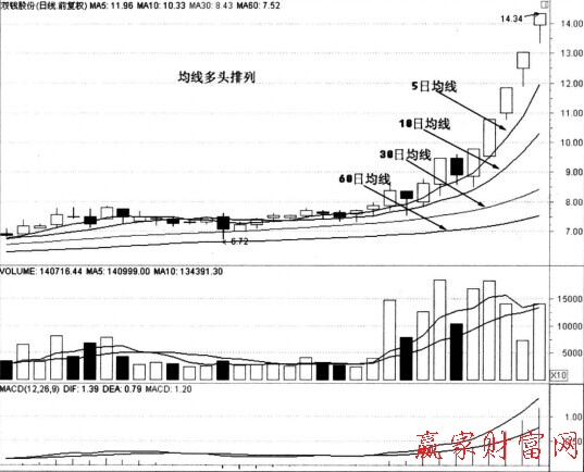 下圖為雙錢股份日K線圖。該股在上漲初期出現5日均線、10日均線、30日均線和60日均線多頭排列形態。說明該股中線行情已經啟動,投資者應該及時跟進,該股隨后出現了翻倍行情。