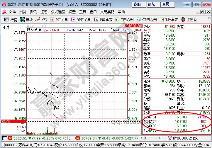 上圖是萬科A在昨天交中的分時走勢,圖中在10.47分中有的識貨有一筆大膽2196。為什么會有這樣的走勢?大家可能會想到:主力自己和自己交易。這是對倒的情況,它的直接作用就是拉高股價,投資者如果繼續觀察就會發現在之后的交易中比較活躍,成交量也會明顯增多,股價出現上漲的情況。但股市是不可能因為掛單的突然增多就有很多的買單或者是賣單,因此,主力把掛單一直放在那二是毫無意義的,這也是在前面所提到的主力自己進行交易的原因。