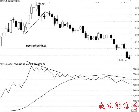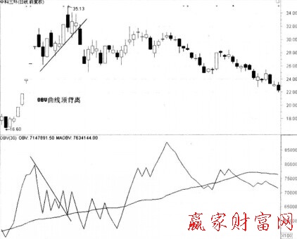 上圖為深天馬A日K線圖。該股經過一段時間上漲后,OBV曲線和股價走勢出現頂背離,發出賣出信號。投資者在遇到這種走勢時應該保持高度警惕,如果股價走勢變弱,應該及早賣出手中股票。
