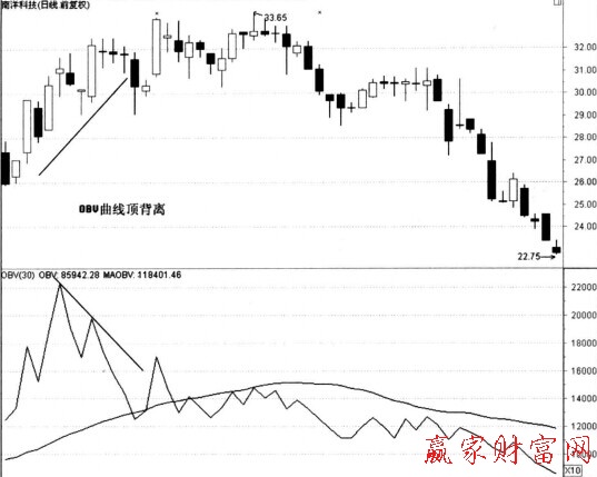上圖為南陽科技日K線圖。從圖中我們可以看到股價在高位與OBV曲線走勢出現頂背離,說明買方力里已經減弱。該股在出現OBV頂背離后出現了階段性頂部。