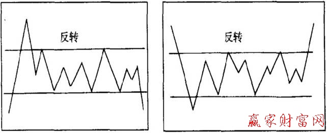 股價變動并非一成不變的,受客觀與主觀環境改變,原居優勢的一方會在盤檔行情的末期失去控制權,使股價運動方向發生絕對性的改變,亦即由上升行情轉為下跌行情,從原本不斷創新高價的走勢轉變成股價日趨下游。抑或由下跌行情轉為上升行情,從原本不斷出現新低價的走勢轉變成股價不斷向上竄升,脫離盤檔行情稱為反轉(如下圖)。