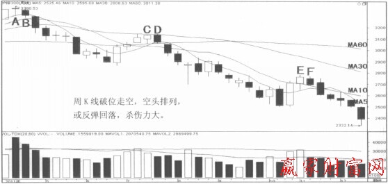 E~F點:周均線10周、30周、60周均線完全空頭排列,周K線超跌反彈,至E點遇阻回落。