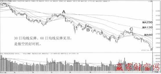 若價格超跌反彈,回升至下壓長期均線,反彈受阻,則是賣空的好機會。一般周K線反彈沖項,很有可能出現快速下跌。