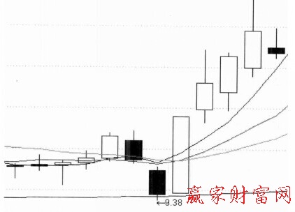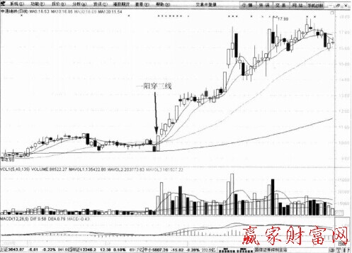 A.一根大陽甚至漲停大陽線穿過3根均線。這三根均線為5日、10日、20日、30日、60日、120日中的任意三根;