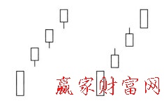 升勢受阻,出現在上漲行情中,由3根陽線組成,這3根陽線的實體越來越小,最后一根陽線的上影線很長。升勢受阻的圖形如圖所示。