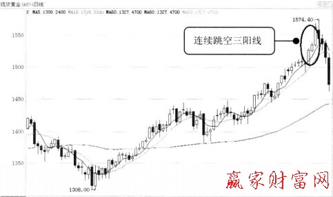 由于一鼓作氣,再而衰,三而竭,多方用盡了最后力氣,此時,若空方趁機組織力最反攻,多方就無力抵抗。所以在上漲途中出現連續跳空三陽線K線組合后,往往是漲勢到頭的征兆,這預示金價不久就會由漲轉跌。因此,投資者見此K線圖,就要立即做減倉操作,如果日后金價掉頭下行,就要及時停損離場。