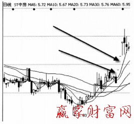 如圖中所示為ST中房日K線圖。圖中箭頭所指的兩個區域為兩個向上的跳空。原本在調控前,市場處于上漲后的盤整期,多空雙方激烈交戰,向上跳空形成后,價格從盤整轉向繼續上漲。