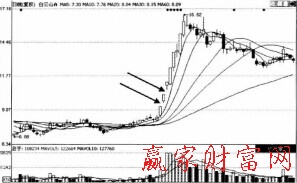 再如圖所示為白云山A日K線圖。圖中箭頭所指的兩個空白處為兩個向上的跳空。在跳空之前,價格處于一個盤整的過程中,而且盤整的持續時間很長,這時連續出現兩個跳空,說明買方取得了戰斗的勝利,后市依然看漲。