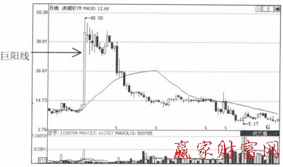 圖1顯示的是浪潮軟件(600756)的月K線圖。該股在2000年3月份拉出一根巨陽線,漲幅高達233.60%,這根超級巨陽線的出現,宣告該股這輪上升行情即將結束,隨后股價呈現不斷向下尋底的走勢。所以巨陽線出現后,投資者要及時開溜。