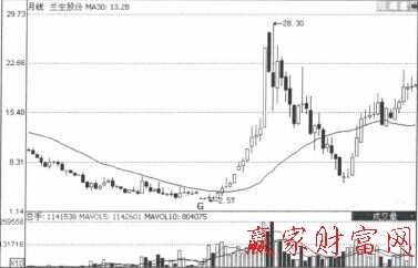 圖2顯示的是蘭生股份(600826)的月K線圖,該股在經過連續11個月平穩上漲后,突然拉出一根巨陽線。顯然這根巨陽線充當加速趕頂的角色。在巨陽線后,該股收出一根高開低走的陰線,即出現烏云蓋頂K線組合,接下來又收出一根螺旋槳,這些都可以進一步確認見頂性質,所以這里投資者要及時清倉離場。這里股民朋友千萬要注意炒股心態。