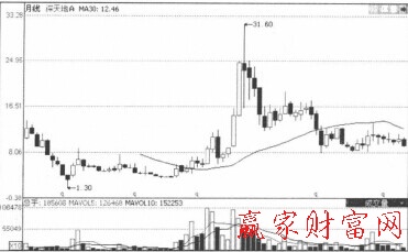 圖3顯示的是深天地A(000023)的月K線圖。該股的兩根巨陽線就像兩個雜技演員,一個人站在另一個人的肩上,表演著疊羅漢。從多年的實戰經驗來看,無論大盤還是個股,出現這樣的巨陽線,表明行情基本走到頭了,即使后面有上漲,漲幅也不會很大,短期見頂的概率相當大。