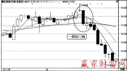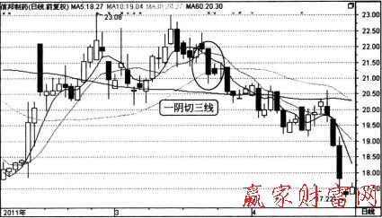 一陰切三線也可稱(chēng)為斷頭鍘,斷頭鍘很形象地說(shuō)明了這種K線形態(tài)對(duì)股價(jià)和未來(lái)走勢(shì)的影響。此時(shí)空方勢(shì)力突然爆發(fā),多頭能量被迅速打壓,出現(xiàn)這種情況后一定要注意尋找賣(mài)點(diǎn)。