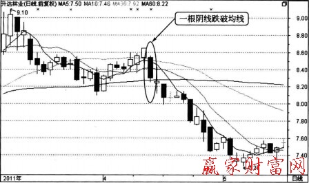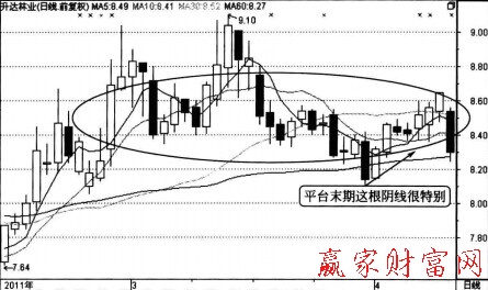 如下圖所示為升達(dá)林業(yè)2011年2月到4月的走勢(shì)。從圖中可以看出,該股在平臺(tái)后突然一根大陰線跌破多日均線,此時(shí)股價(jià)走壞的幾率大增,再如下圖所示。