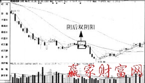 此形態(tài)是指一根陰線之后出現(xiàn)反彈的兩根陽線,但隨后又出現(xiàn)一根陰線,表明空頭力是仍然比較強大。陰后雙陰陽的形態(tài)如圖所示。
