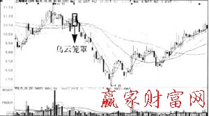 烏云籠革是兩根K線的組合形態(tài)。其中第1根K線是陽線,第2根K線是大陰線,表示趨勢反轉已經(jīng)發(fā)生,隨后將可能出現(xiàn)較長時間的下跌。一般陰線實體的收盤價下穿入人前一個陽線實體的程度越深,該形態(tài)構成市場頂部的機會就越大。烏云籠翠形態(tài)如圖所示。