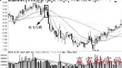 雙飛烏鴉指的是在股價高位連接出現(xiàn)的兩根陰線。在出現(xiàn)此種形態(tài)的前一天是一根大陽線,顯示多頭全力攀升狀態(tài),但隨后又出現(xiàn)兩根陰線,表示牛市已被遏制,股價將下跌。雙飛烏鴉形態(tài)顯示如圖所示。