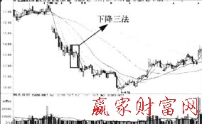 在行情持續(xù)下跌中,出現(xiàn)了一根大陰線,隔天起卻又連續(xù)出現(xiàn)三根小陽線,此時并不能說明行情將反轉,如果接下來出現(xiàn)一根大陰線,則表明價格將持續(xù)往下探底,為賣出信號。下降三法的形態(tài)顯示如圖所示。