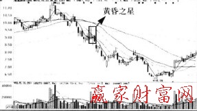 與早晨之星相反,黃昏之星是典型的頂部反轉形態(tài),通常出現(xiàn)在股價大幅上漲之后。黃昏之展由3根K線組成,其中第1根是長陽線,第2根是帶上下影的十字星,往往還會伴隨著向上跳空缺口,第3根是長陰線,實體達到第1天陽線實體的中部。黃昏之星的出現(xiàn)預示著黑暗已經(jīng)來臨,股價將下跌。黃昏之星的形態(tài)顯示如圖所示。