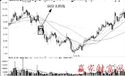 股價位于相對高位,短期內(nèi)在相同的價位上出現(xiàn)了兩根大陰線,說明在該壓力位受到了較大的阻擋,很難突破,表明后市很可能再次下跌膚,投資者應該到此價位的時候退場觀望。同位大陰線的形態(tài)顯示如圖所示。