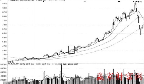 當(dāng)K線圖與10日移動(dòng)平均線糾纏在一起時(shí),千萬(wàn)不要輕易跟進(jìn)。只有等10日移動(dòng)平均線與K線圖分開(kāi)且上行時(shí),才是買(mǎi)入信號(hào),如圖所示,表明多方力最增強(qiáng),后市上升的幾率變大。