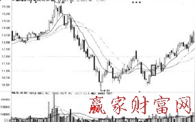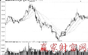 股價(jià)下跌到了低點(diǎn),形成W形底以后,隨后連續(xù)出現(xiàn)的陽(yáng)線向上突破了30日移動(dòng)均線,說(shuō)明此時(shí)股價(jià)上漲的概率已經(jīng)遠(yuǎn)遠(yuǎn)大于繼續(xù)下跌的概率。在股價(jià)突破30日移動(dòng)均線的初期,由干均線的滯后性,往住并未改變下降趨勢(shì),經(jīng)過(guò)幾天的上漲之后,30日移動(dòng)均線的趨勢(shì)就會(huì)改變。一旦均線轉(zhuǎn)頭向上,便意味著上升趨勢(shì)的確立,如圖所示,在這個(gè)位置進(jìn)行建倉(cāng),必然實(shí)現(xiàn)盈利。