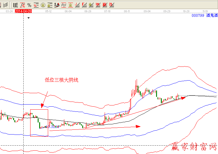 股價經過長時間的下跌之后,做空動能已得到了一定程度的釋放,此時突然拉出大陰線,而且連續(xù)三天如此,這不是普通投資者能做到的,很明顯是莊家所為,故意制造跳水的恐慌,目的是為了打壓吸籌。股價經過這最后一跌后,往往會快速拉升,而一旦回升,漲幅是驚人的。因此,低位三根大陰線是明確的見底信號,隨之而來的往往是大幅反彈或中線行情。具體如下圖: