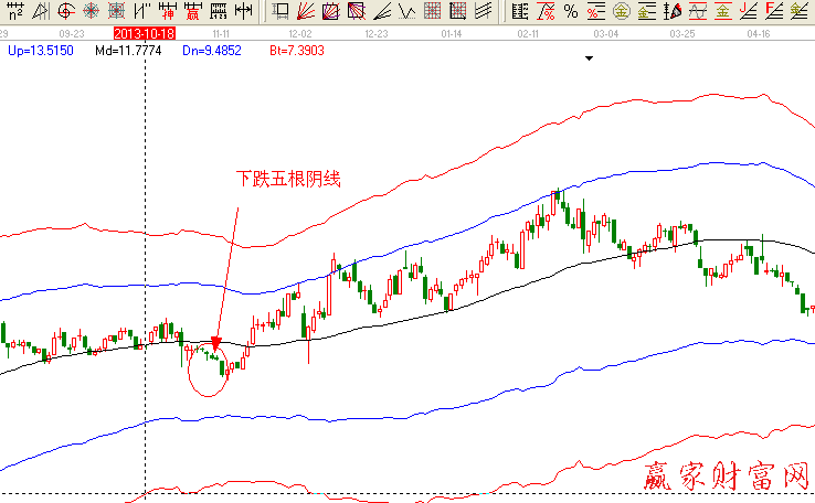 需要知道的是,如果五根陰線之后沒有出現大陰線,而是以多根小陰線代替,或者五根陰線中有一根陽線,只要股價出現見底跡象,一樣可以買入。