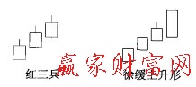 紅三兵由三根陽K線組成,且三根K線的最高價位不斷抬高。徐緩上升形K線組然后突然拉出一根大陽線以確認上升趨勢的形成。紅三兵和徐緩上升形出現在經過大幅下跌后的上漲行情初期,可以作為積極買進信號。紅三兵和徐緩上升形的標準K線圖形如下圖所示。