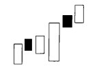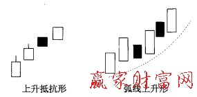 上升抵抗形K線組合般由三到五根K線組成,每根K線都較前一根K線跳空高開,即使某一根K線收出陰線,其收盤價也比前一根K線的收盤價高的K線組合。弧線上升形K線圖形由若干個K線組成,使股價的底部不斷抬高,總體上看,股價是在一個弧形底部向上攀升。上升抵抗形和弧線上升形K線組合在上漲途中出現,可以作為積極的買進信號,其標準圖形如下面所示。