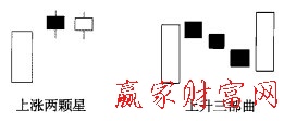 上漲兩穎星由三根K線組成,第一根為大陽線或中陽線,接著有兩根為實體較小的K線或十字星組成。后面兩根K線可陽可陰,且其中心需高于第一根陽線的收盤價或在其收盤價附近。上漲兩穎星中的“兩穎星”也可以是三顆星,其含義不變。上升三部曲一般由五根K線組成,第一根為大陽線或中陽線,接著出現三根小陰線,三根小陰線最后一根的收盤價不應低于第一根陽線的開盤價,最后拉出一根大陽線或中陽線。最后那根陽線的收盤價應高于第一根陽線的收盤價。上漲兩顆星和上升三部曲出現在上漲途中,持股的投資者可以繼續看漲,其標準圖形如下所示。