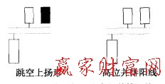 跳空上揚形K線由兩根陽線一根陰線組成,先拉出一根跳空向上的陽線,留下一個缺口,第二天又出現一根高開低走的陰線,但該陰線的收盤價收在跳空缺口上方附近,使缺口暫時留下。跳空缺口一旦回補,就不能視其為跳空上揚形K線組合。高位并排陽線的K線組合圖形和跳空上揚形K線組合有些相似,只是第三根K線為低開高走的陽線,同時第二根K線和第三根K線的最低價位基本位于同一水平位置。跳空上揚形和高位并排陽線的標準K線組合如圖所示。