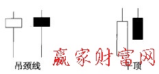 吊頸線就像一個(gè)上吊的勇士,其結(jié)果就不言而喻了。吊頸線實(shí)體很小,下影線至少是實(shí)體長(zhǎng)度的兩倍,上陰線很短或沒(méi)有,陽(yáng)線陰線均可。吊頸線在上漲途中出現(xiàn),特別在大漲后出現(xiàn),其見(jiàn)頂可能性極大。平頂至少由兩根K線組成,K線的最高價(jià)處于同一水平位置。吊頸線和平頂在上漲趨勢(shì)中出現(xiàn),是見(jiàn)頂信號(hào),后市看跌。吊頸線和平頂?shù)臉?biāo)準(zhǔn)圖形如下所示。