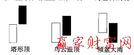 塔形頂、烏云蓋頂和傾盆大雨都是由兩根K線組成,第一根為大陽(yáng)線或中陽(yáng)線,第二根為大陰線或中陰線。三者的區(qū)別在于兩根K線的排列位置不同,且見(jiàn)頂信號(hào)從塔形頂、烏云蓋頂?shù)絻A盆大雨逐級(jí)加強(qiáng),投資者需要仔細(xì)辨別。以塔形頂、烏云蓋頂和傾盆大雨三種方式見(jiàn)頂?shù)墓善蓖碌俣容^快,在兩三個(gè)交易日內(nèi)往往跌幅可以超過(guò)10%,投資者需要格外小心。塔形頂、烏云蓋頂和傾盆大雨三種K線組合的標(biāo)準(zhǔn)圖形如下圖所示。
