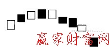 圓弧頂是由若干根小陽(yáng)線或小陰線組成的頂部形態(tài),最后以向下跳空缺口的方式確認(rèn)圓弧頂?shù)某闪ⅲ瑘A弧頂部一旦得到確認(rèn),其后市下跌的可能性極大。圓弧頂?shù)臉?biāo)準(zhǔn)K線組合圖形如圖所示。